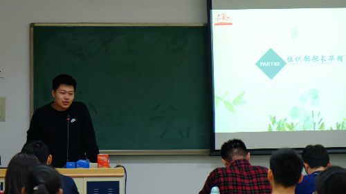 接着,组织部部长毕锴芃发言。他首先提到党促是一个紧张活泼的组织,并欢迎新一级同学就加入这个大家庭。然后他介绍了组织部的具体工作,并强调其细致的特点。最后,他分享了个人员工工作的经历,强调了党促带给他的温馨之感,并提醒大家做好员工工作和学习之间的权衡。