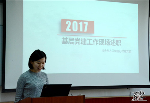随后,由2017级人口学硕士党支部书记郑阳述职。她简单介绍了支部基本情况,通过回顾一年来支部的工作,她认为支部现阶段分工明确,支部成员们学习情况良好,态度端正,总体上表现良好。对于今后的发展方向,她提出希望党支部和团支部能进一步加强合作,促进双方共同发展。党委委员巫锡炜对该支部的工作予以充分肯定,并建议他们从专业的眼光看待党支部工作及学习,多开展周边调研,在实际生活中坚定自己的理想信念。