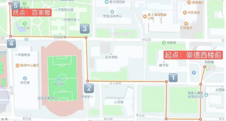 参加健身跑活动的运动员们们从崇德西楼出发,经过教二草坪,绕过田径场,最终到达目的地----百家廊。