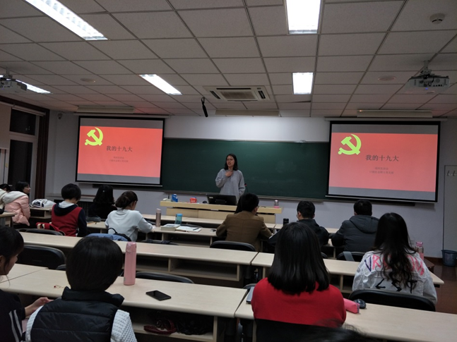 首先党支部书记杨钰晨分享了十九大的会议精神。她讲到:“我们一定树牢‘四个意识’,坚定‘四个自信’,更加紧密团结在以习近平同志为核心的党中央周围,不忘初心、牢记使命”。