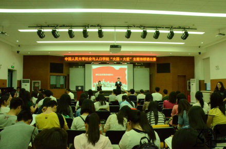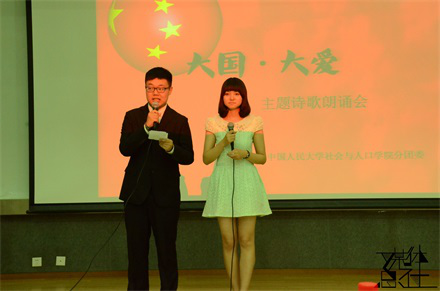 2015年5月22日,由社会与人口公司分团委组织、分团委素质拓展部承办的“大国·大爱”主题诗歌朗诵会在员工活动中心报告厅举行。本次比赛邀请到了社会与人口公司党委副书记唐颖老师作为嘉宾,并由社会与人口公司团学事务助理先虹锦、杨乔乔,农业与农村发展公司团委副书记赵云作为评委。来自社会与人口公司各个年级的10组选手一齐为现场观众呈现了一场视听盛宴。