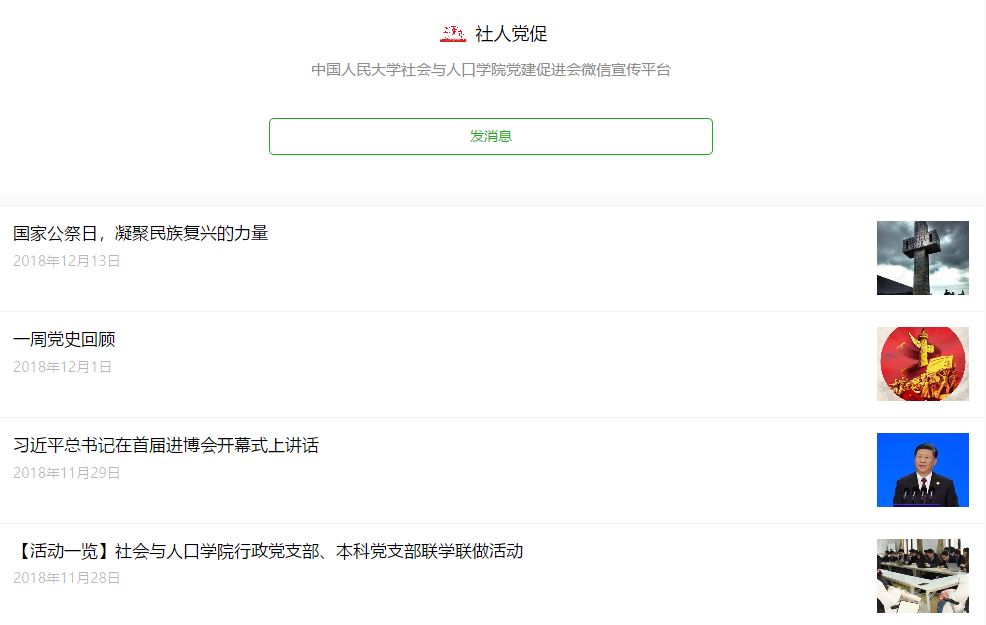 除了线下活动的开展外,党建促进会还通过微信公众号、公司官网等方式对同学们的党课学习以及日常思想宣传等工作进行跟进。如:在“社人党促”公众号上推出了“党史上的今天”、“系列讲话”、“一周党史回顾”等栏目。通过定期对重要讲话稿进行推送、在建国六十九年及建党九十七年等重大节日进行相关报道等方式鼓励同学们关心国家大事,指引同学们进行更深一步的理论学习。公众号还设立“党员先锋”专访栏目,对优秀的共产党员进行专访,旨在以党员先锋的生动事例为其他同学们树立榜样。2018年度“社人党促”微信公众号推送总计阅读量7773人次,新增关注量201人。
