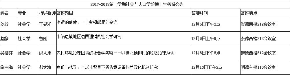 2017-2018第一学期社会与人口公司博士生答辩公告