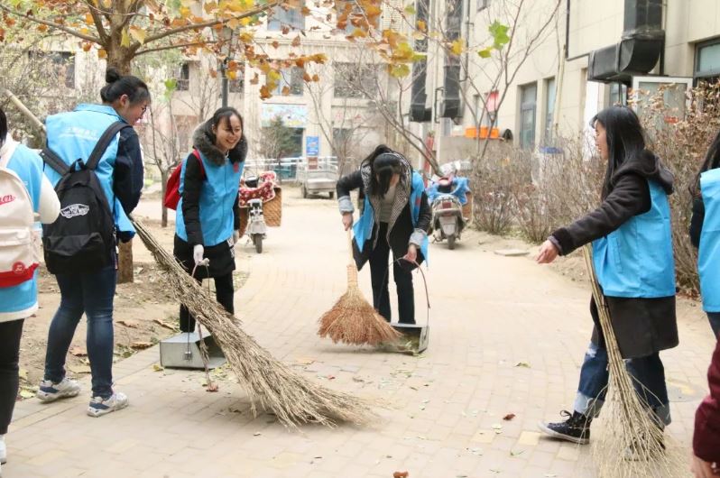 寒冷的天气并没有降低同学们参与志愿服务的热情,大家都积极认真地工作。尽管同学们之前都没有清扫落叶的经验,但大家还是很快掌握了清扫的诀窍。通过小组队员的分工配合,有的同学用扫帚归拢四处飘散的落叶,有的同学将归拢后的落叶扫入簸箕、装入垃圾袋。大家不仅非常专注地完成自己的工作,组员之间的配合也十分默契,完成任务较快的小组还主动帮助其他小组清扫。最终,大家在半个小时之内完成了整个小区的清扫工作。