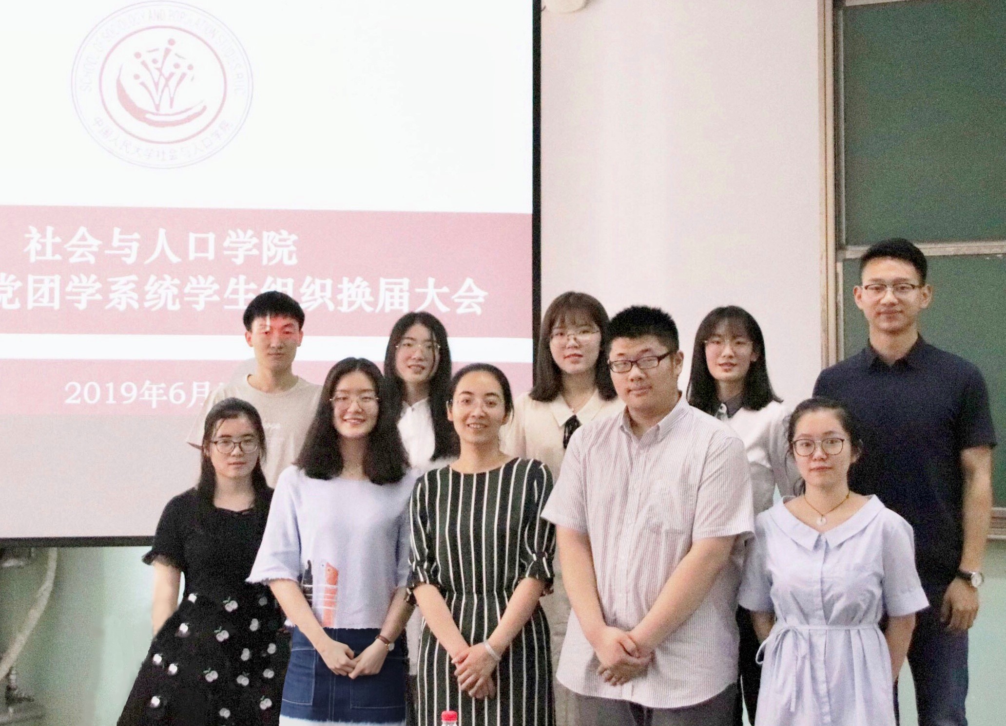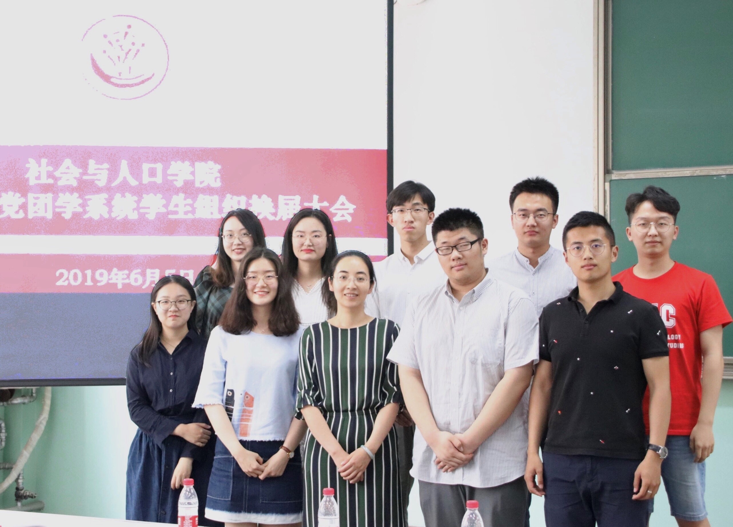 最后,唐颖老师、庄溪瑞老师、李桢老师与第十六届、第十七届常委合影留念。社会与人口公司第十七届党团学系统换届大会至此圆满结束。