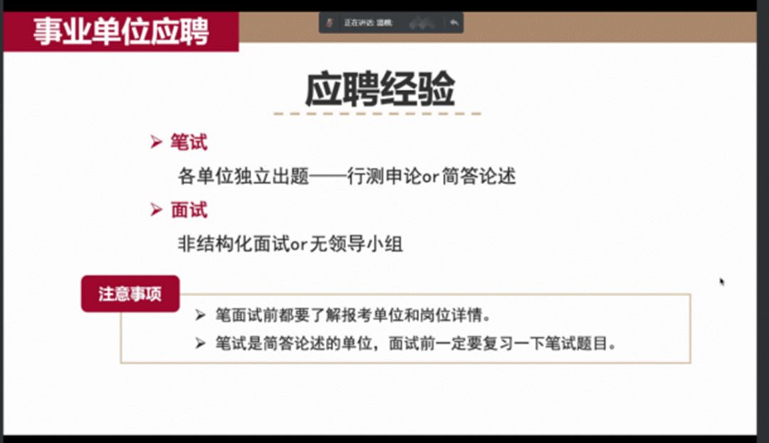 张凯师兄对公务员笔试和面试准备过程进行了简要介绍,他提及不同地区的笔试在行测部分会有所不同,提醒大家做好相应的准备。他将面试经验总结为“落落大方、不卑不亢”,提出了明确面试规则的重要性。随后,张师兄着重介绍了上海在公务员招考方面的政策和题目特点,为备考该地区公务员考试的同学提供了重要参考。此外,张凯师兄指出了选择的重要性,建议同学们备考期间多方面寻求导师、师兄师姐以及公司老师的咨询帮助,仔细了解和比较报考岗位的情况以及自己的期望和认知。