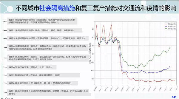 基于研究结果,许小可教授认为,潜伏期具有重要作用,需要高度重视新冠肺炎潜伏期和检测能力等影响因素,同时对于城市人口数量因素的研究在一定程度上吻合了辛普森悖论的逻辑思路。在家庭研究中,许老师发现家庭中发生的聚集性疫情占83%以上,其具有广泛性和严重性。并且,家庭内异性传染能力高,家庭外同性传染概率大,家庭聚集性疫情与社会传播相互耦合形成更大传播。研究发现新冠肺炎传播的确反映出“女主内”的社会模式,但是对于“男主外”的社会模式反映并不明显。最后,许老师列举了不同城市社会隔离措施和复工复产措施对于交通流和疫情的影响。