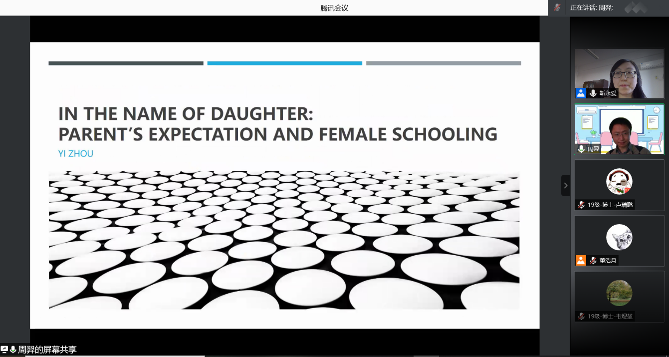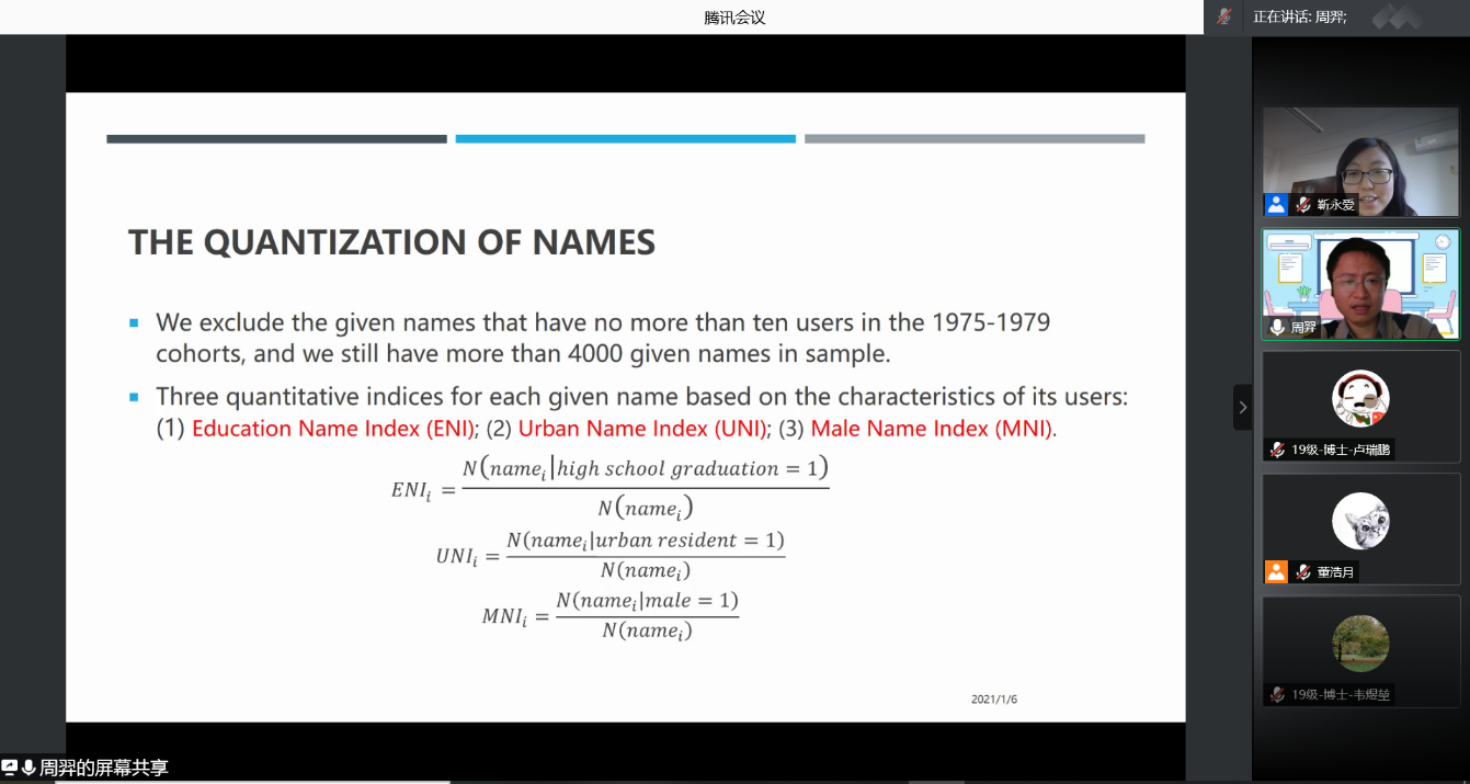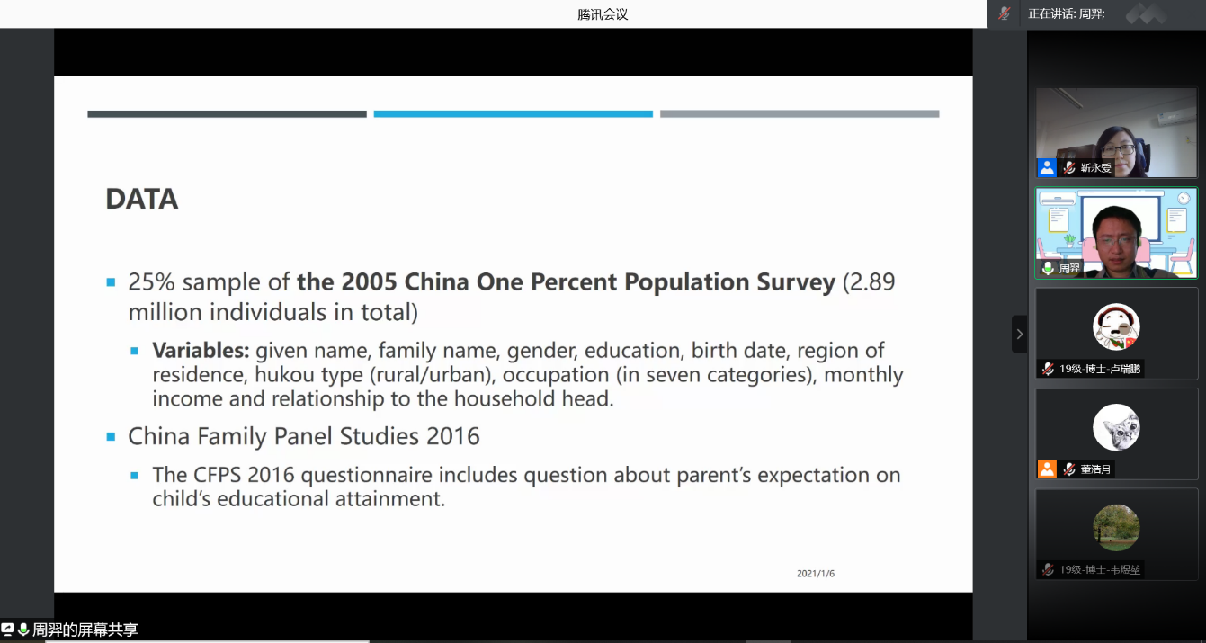 2021-01-11 文:WilliamHill中文官方网站 图:WilliamHill中文官方网站2021年1月6日中午,人口学系刘铮系列学术讲座暨严肃的人口学八卦青年沙龙成功举办。北京大学社会研究中心助理教授周羿博士在腾讯会议,以“In the Name of Daughter : Parent's Expectation and Female Schooling”为主题做了一场人口学专业的线上学术讲座。williamhill官方网站社会与人口公司靳永爱副教授主持了本次活动,williamhill官方网站社会与人口公司人口系的70多名师生听取了报告并进行交流学习。