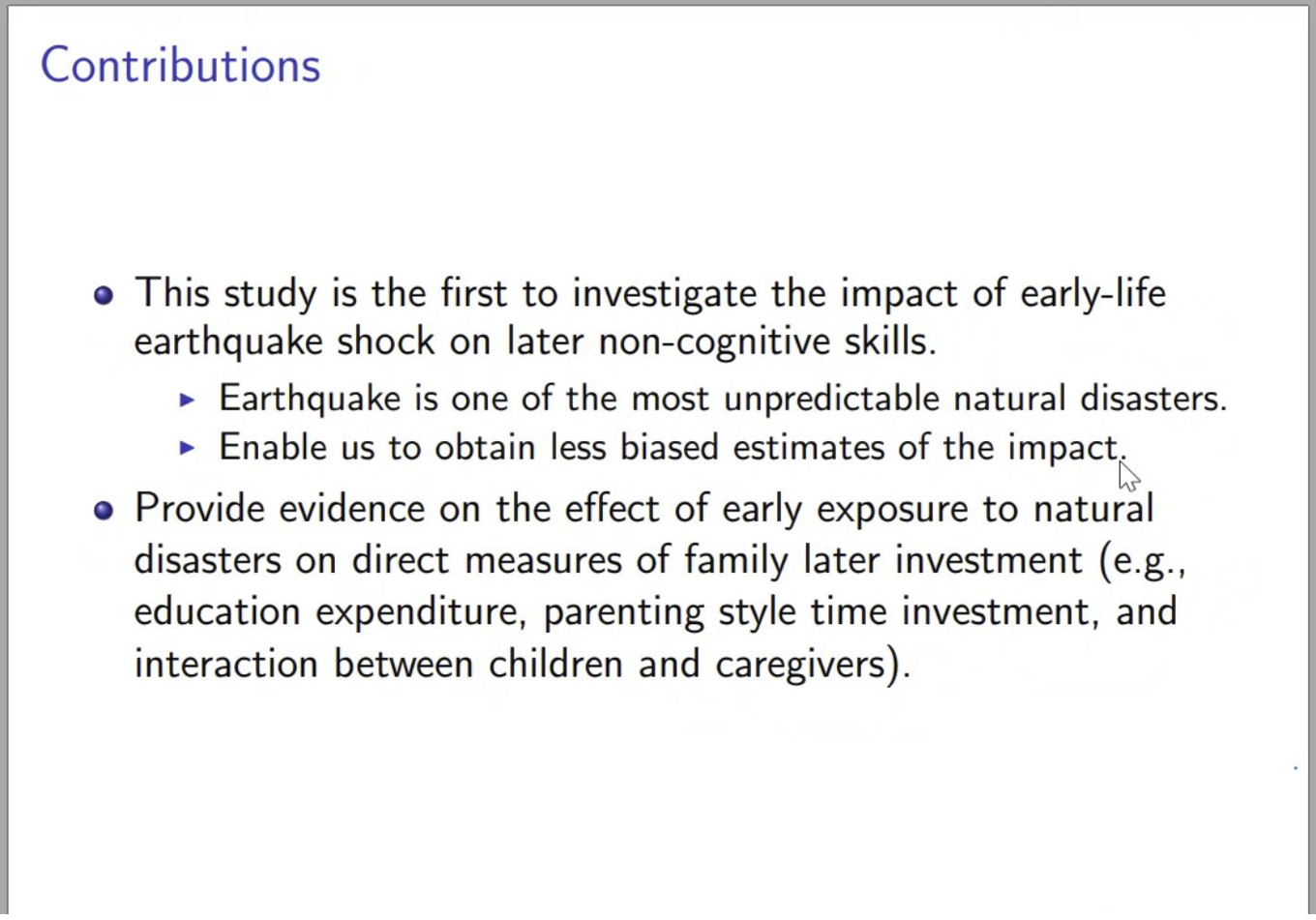 结果显示,经历过地震的孩子的非认知能力会受到负面影响,并且这种负面影响存在社会经济地位和性别间的异质性。更低社会经济地位家庭的孩子和女孩受到的负面影响更强。其中,地震经历导致的早期生理损伤和家庭投资的不同是这种异质性的成因。家庭内部倾向于对经历过地震的男孩分配更多资源,从而导致了男孩在后期成长的优势。