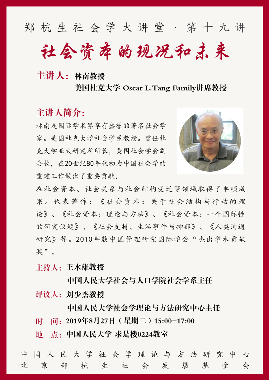 教授简介:林南是国际学术界享有盛誉的著名社会学家。美国杜克大学社会学系教授。曾任杜克大学亚太研究所所长,美国社会学会副会长,在20世纪80年代初为中国社会学的重建工作做出了重要贡献,在社会资本、社会关系与社会结构变迁等领域取得了丰硕成果。2010年获中国管理研究国际学会“杰出学术贡献奖”。