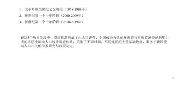 宋月萍认为随着流动人口规模扩大,社会越发关注,因此针对流动人口的调查和研究是非常有必要的。随后她介绍,在相关调查中对于流动人口的概念界定是不断调整的,统计口径也不尽一致。在介绍我国流动人口统计调查发展历程时,她根据样本规模、地域范围、调查内容、执行机构等因素划分了3个主要历史阶段:改革开放至世纪之交(1978-1999年)、新世纪第一个十年(2000-2009年),以及新世纪第二个十年(2010-2019年)。在第二阶段,我国开始出现针对流动人口群体的各项专类调查,而第三阶段中,人口流动调查开始注重地区代表性,政府也愈发重视流动人口群体。