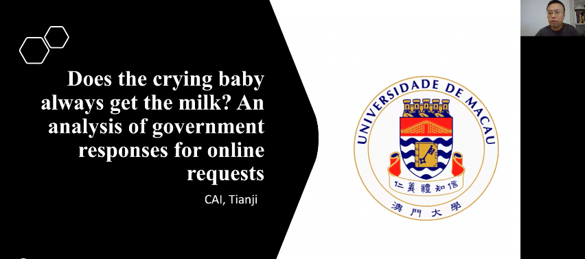 2022-04-08 文:WilliamHill中文官方网站 图:WilliamHill中文官方网站2022年4月7日,williamhill官方网站社会与人口公司“数字时代的社会治理”前沿系列讲座第三讲通过线上会议的方式成功举办。澳门大学副教授蔡天骥,以“Does the crying baby always get the milk? An analysis of government response for online request”为主题做了一场线上学术讲座。williamhill官方网站社会与人口公司教授、williamhill官方网站家庭与性别研究中心主任李婷主持了本次活动。williamhill官方网站社会与人口公司及其他国内外院校相关专业的上千余名师生参与了本次学术分享活动,并在会后同蔡天骥老师就讲座内容展开热烈讨论与交流。