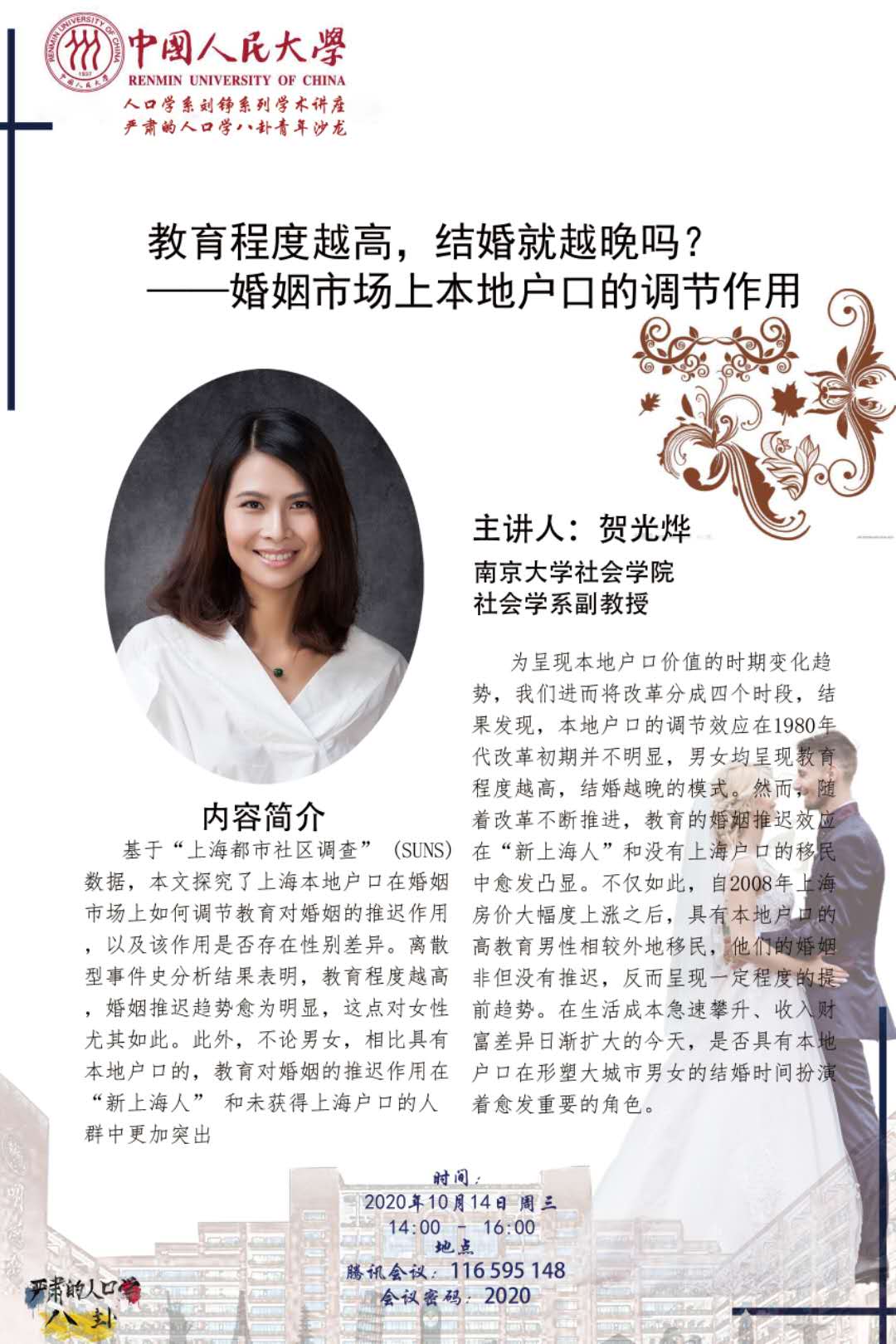 讲座回顾 | 贺光烨:教育程度越高,结婚就越晚吗?——婚姻市场上本地用户的调节作用