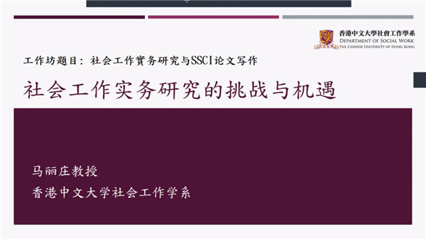 2020-11-17 文:WilliamHill中文官方网站 图:WilliamHill中文官方网站11月16日下午,社会工作与社会政策前沿系列讲座第22期通过线上、线下相结合的方式顺利举办。本次讲座邀请了香港中文大学社会工作学系马丽庄教授,以“社会工作实务研究:以家有多动症儿童和多元家庭小组的成效评估为例”为题进行分享。讲座由社会工作与社会政策系祝玉红副教授主持,参加此次讲座的有社会工作与社会政策系本科生及研究生,还有其他院校社会工作系的老师和同学。