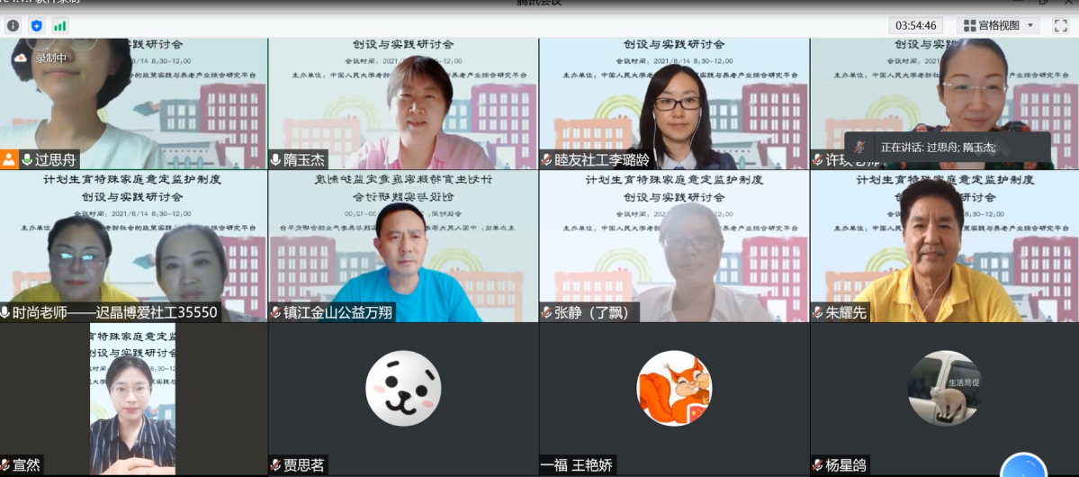 2021年8月14日,计划生育特殊家庭意定监护制度的创设与实践研讨会顺利举办。该论坛由williamhill官方网站老龄社会的政策实践与养老产业综合研究平台主办,北京睦友社会工作发展中心、上海闵行区尽善社会监护服务中心、江苏省镇江市慈善(红十字)金山公益志愿服务总队、常州春晖爱心家园、延边朝鲜族自治州光芒爱心公益协会、北京市第一社会福利院社工科、北京工业大学耿丹公司家庭发展与研究中心等单位的代表参加了该论坛的研讨。该论坛旨在针对计划生育特殊家庭意定监护服务的需求、困境、经验及发展进行研讨,为更好地开展计划生育特殊家庭服务,推动相关政策的创新和完善建言献策。参加研讨会的还有相关机构的工作人员、志愿者和社会与人口公司的博士生、硕士生。