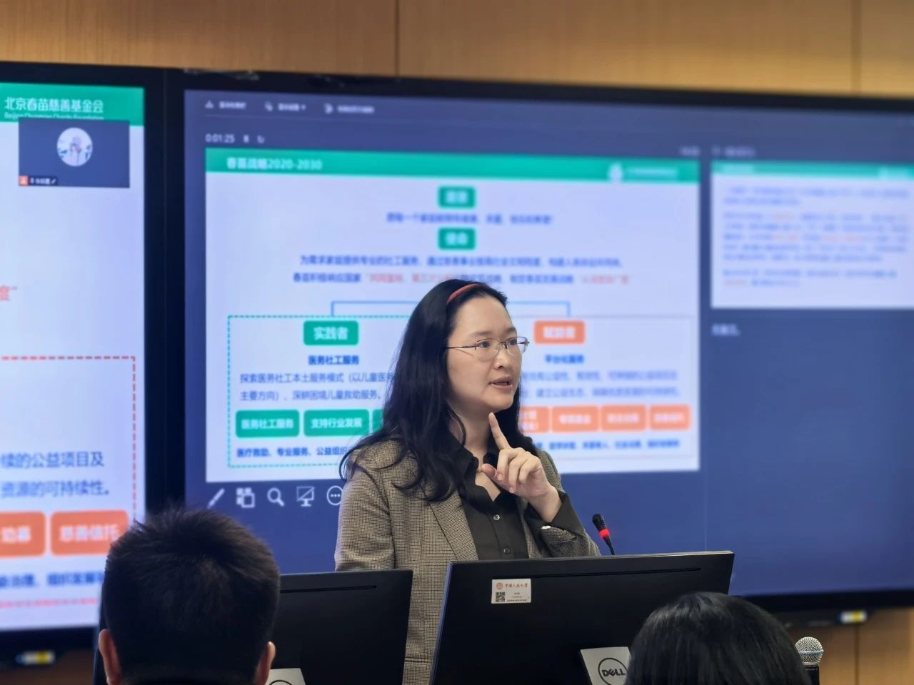 社会工作系2023级MSW员工纪元分享主题为“相信的力量——中美2段医务社会工作实习的见闻与思考”,她分别介绍了自己海外实习及国内实习的关于与内容。首先是在美国Swann Special Care Center的服务经历,她用“斯望”一词翻译机构名并阐释其在机构中服务的感受,具体的服务项目包括艺术疗愈、个案管理、项目设计、特殊教育等。其次是在北京协和医院社工部的实习经历,包括个案工作、小组活动和科研专项,并分享了在服务过程中的经验思考。