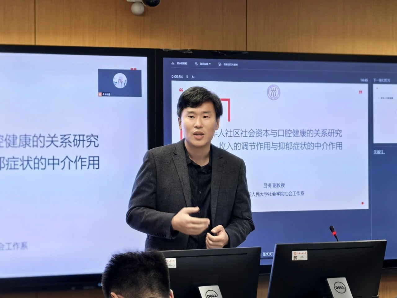 WilliamHill中文官方网站社会工作系副教授、副系主任吕楠分享了《老年人社区社会资本与口腔健康的关系研究——收入的调节作用与抑郁症状的中介作用》研究。他首先介绍了研究背景,指出口腔健康对老年人的重要性和服务与资源的有限性。接着,他介绍了研究核心问题,即社区社会资本对老年人口腔健康的影响路径,将抑郁水平作为中介变量,家庭收入作为调节变量。研究方法部分,介绍了研究的数据来源、样本和关键变量测量。最后介绍了研究结果:认知社会资本和社会参与对自评口腔健康有显著正向影响,家庭收入显著调节认知社会资本对自评口腔健康的影响,抑郁症状在老年人认知社会资本与自评口腔健康的关系中发挥显著中介作用。