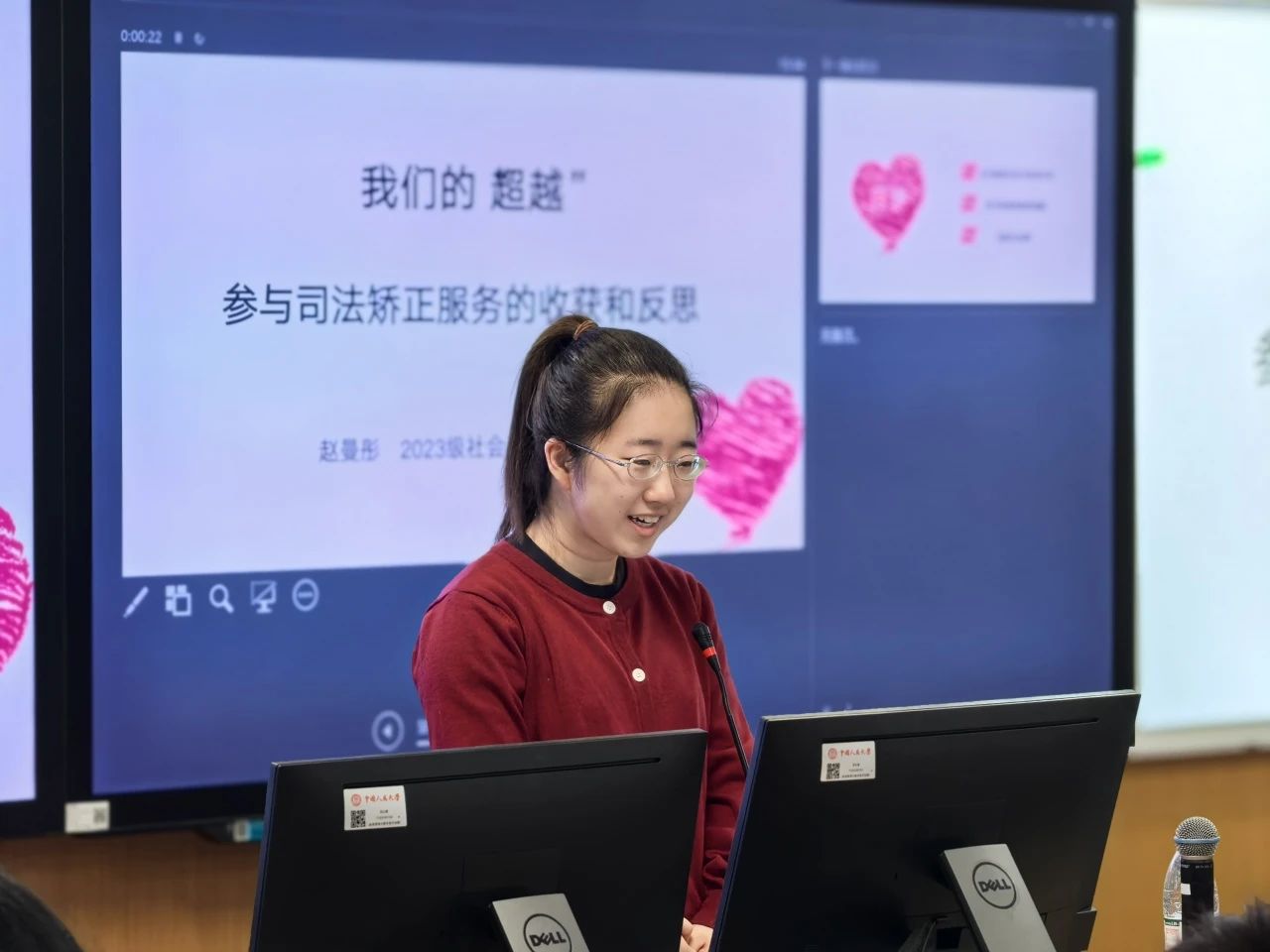 社会工作系2023级MSW员工赵曼彤分享了参与司法矫正服务的收获和反思。她首先介绍了自己的实习机构——北京超越社工事务所的基本情况和服务的主要内容,包括合适成年人服务、训诫帮教和教育矫正服务、被害人救助服务、犯罪未成年人社会调查服务等。接着,她分享了实习中自身价值观、专业价值观和实务实践中的张力和自我的成长。最后,她对自己的实习经历做了总结,认为实习经历帮助自己进一步理解价值伦理、学习实务技巧,放平心态、给自己成长的空间,并通过实务经历反观自身,深化自我认知。
