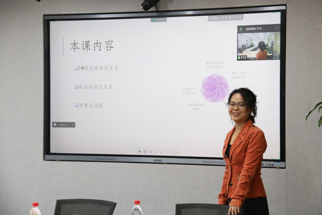 林丹讲授了主题为“进化与社会达尔文主义”的课程。她以最近获得诺贝尔奖的瑞典科学家斯万特·帕博对人类进化的研究贡献,引入探索进化路径和人类多样性的议题。她介绍了对人类学理论有重要奠基意义的进化论者的观点,讲述了社会达尔文主义的内涵并提醒大家警惕其被滥用带来的危害。最后,她提出两个讨论问题,推进大家对工具进步带来的人类“进化”的反思。