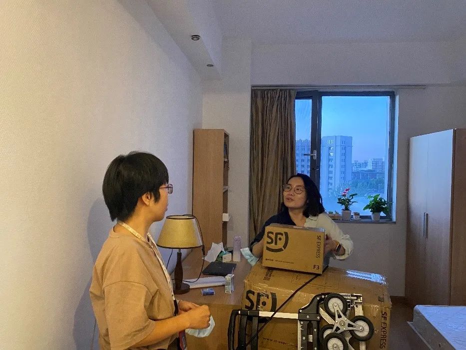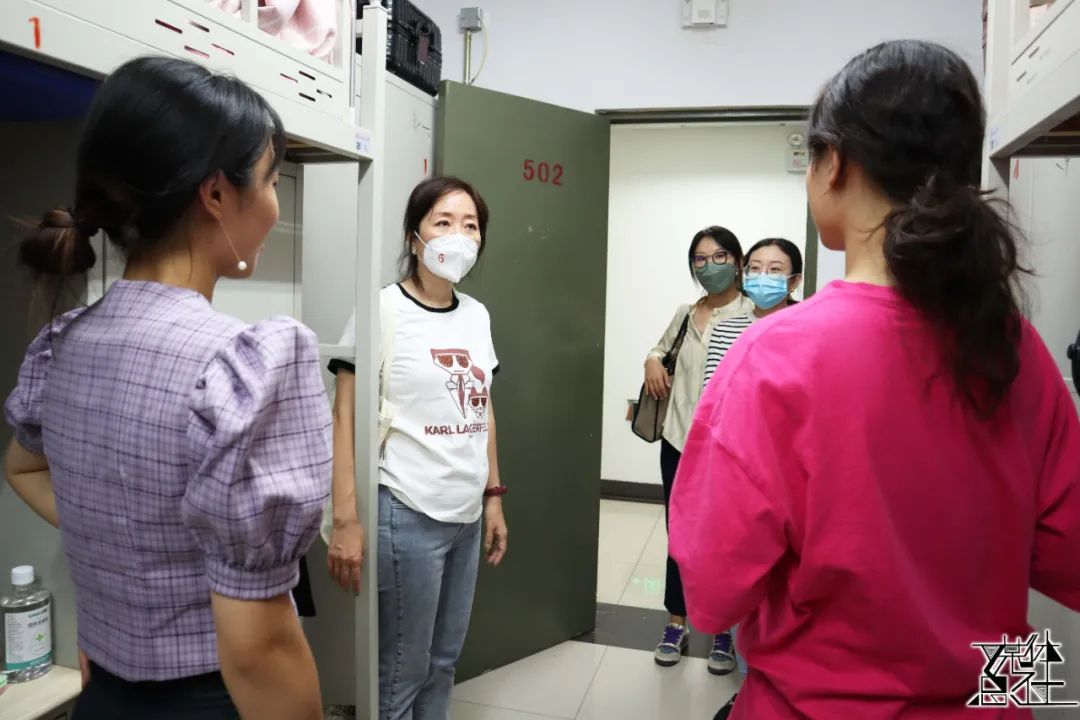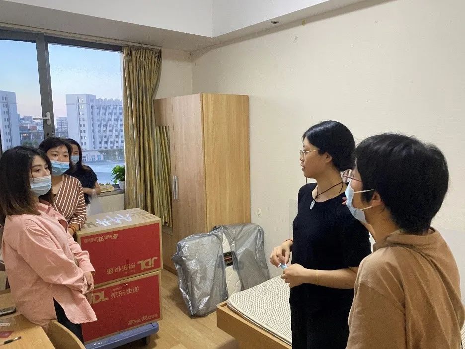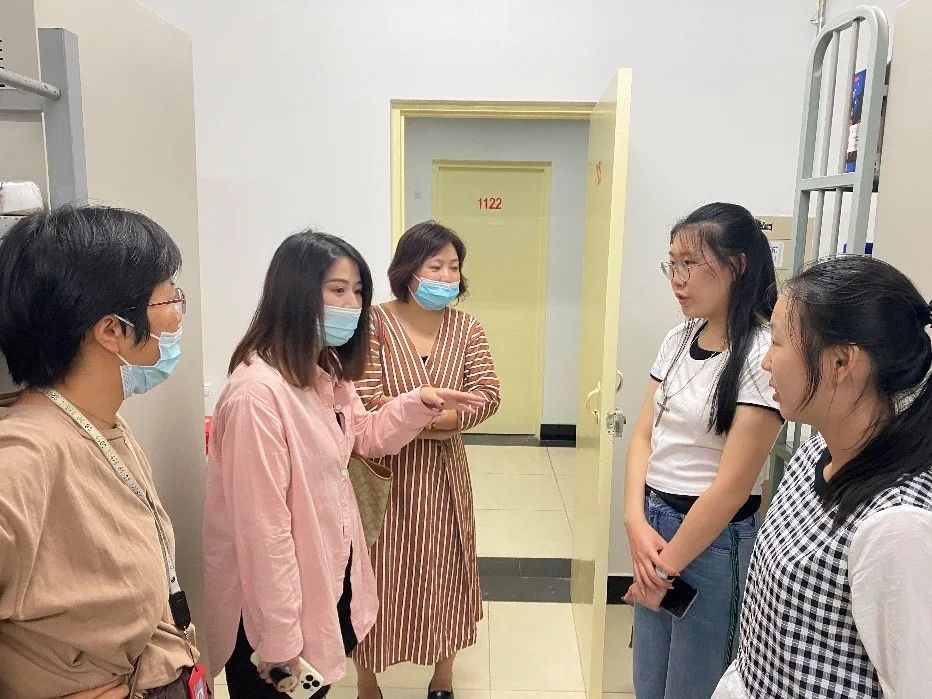 孙权书记和宋月萍副经理分别带领女老师们看望女生硕士及本科、博士新生。新生们对领导、老师的探访表示热烈欢迎。老师们亲切慰问了解新生基本情况,感受寝室条件,并鼓励同学们致力学习、更进一步。老师们也提醒同学们遵守公司防疫政策,按要求及时完成核酸检测,同学们也对老师们的关切表达了感谢。令人温暖的是,老师们帮助新生搬运行李,并和新生家长通过视频电话交流问候,其乐融融。