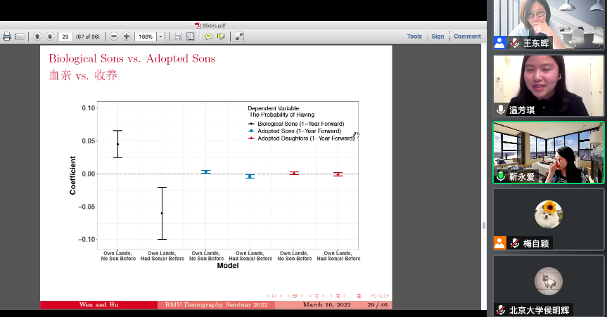 在温芳琪老师的分享结束后,聆听讲座的师生围绕主题踊跃发言和积极交流,就“寻找宏观的外生冲击”、“男孩偏好如何排除儿女双全观念的影响”、“性别偏好如何识别政策约束的效应”、“住房私有化是否为掌握生产资料赋予新意”等问题展开讨论。温芳琪老师对此一一回应,并结合研究中未呈现的稳健性检验结果作出细致而严谨的解释。