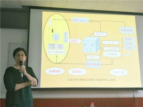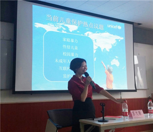 联合国儿童基金会驻中国办事处儿童保护官员苏文颖女士的报告题目为《儿童权利框架下的儿童保护问题》。她从《儿童权利公约》出发探讨了儿童保护的内容,并带领学员就当前儿童保护热点议题进行了深入分析。