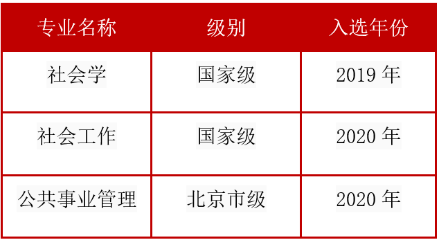 公司社会工作专业获认定为国家级一流本科专业建设点;公共事业管理专业获认定为北京市级一流本科专业建设点
