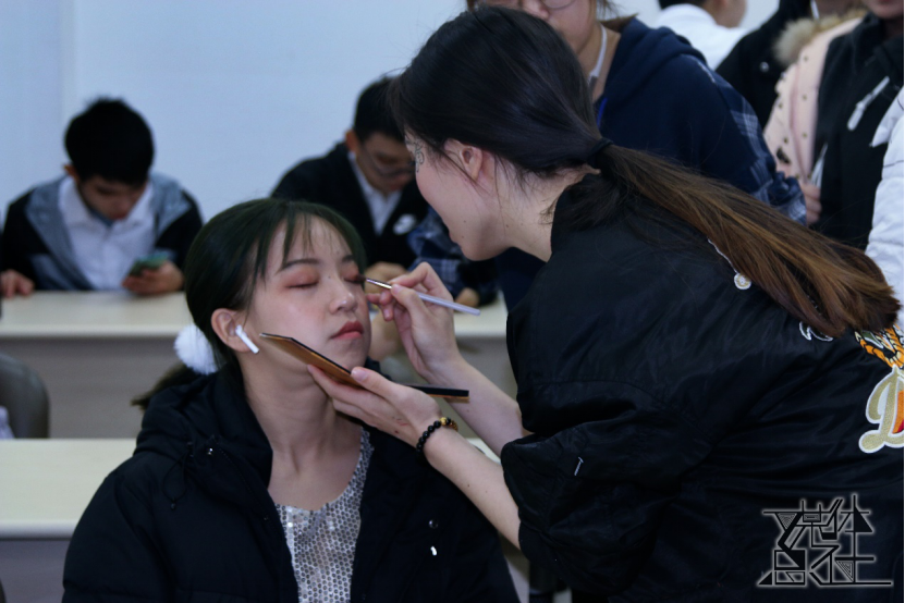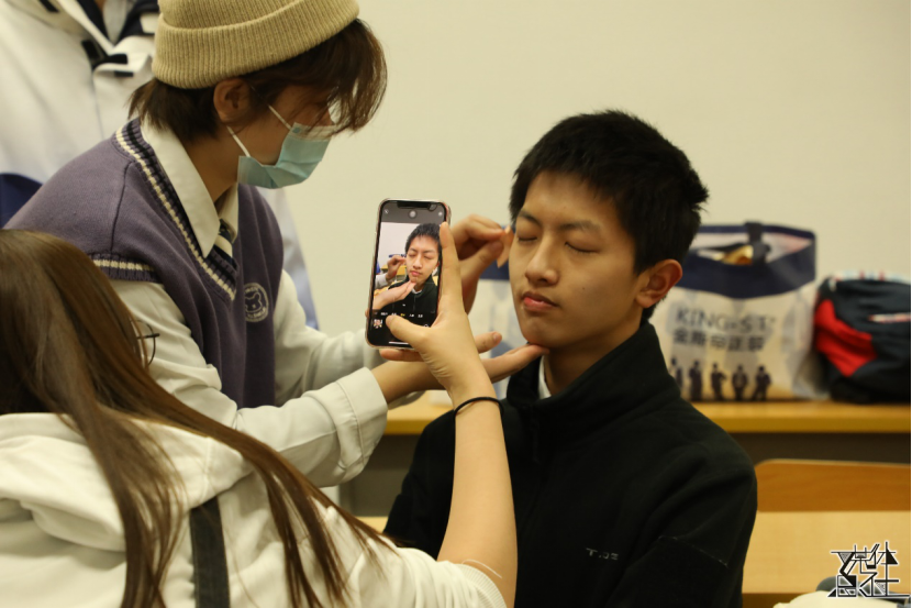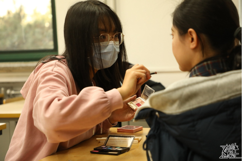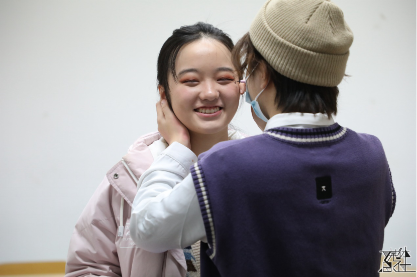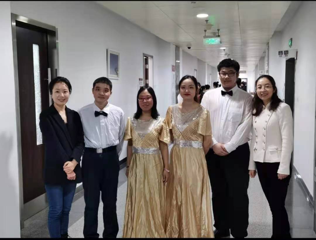 为了确保合唱达到最佳效果,合唱联队的队员和相关工作人员早早便到达教室进行化妆等准备工作。下午1点,社会与人口公司党委书记高燕燕、副书记唐颖来到教室看望参与合唱的老师和同学。正式候场时,女生们都面带精致的妆容,身着黄色礼服,个个光彩靓丽;男生们身着白衬衫,显得精神抖擞。回想着无数个傍晚的训练,大家在舞台后怀着激动的心情等待上台、互相加油打气,负责排练的同学悉心叮嘱要注意的细节。