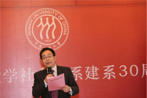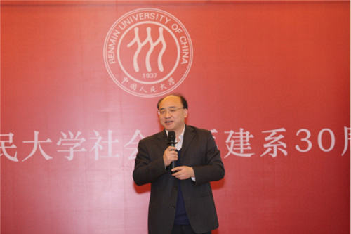 洪大用代表社会与人口公司及社会学系致辞。他表示,郑杭生先生领衔创办人大社会学系的三十年,是中国社会学恢复重建进程的重要组成部分,为中国社会学的发展作出了重要贡献,这是全体师生员工共同参与的结果,是公司、学界同仁和社会各界大力支持的结果,谨向为人大社会学系作出贡献的所有人致以深深的敬意。正是老师和同学们在人大社会学系的共同记忆和对她的深厚感情让大家聚在这里,共同庆祝人大社会学系的三十岁生日。他表示,一个机构的三十年,只能算是刚刚开始。我们在此庆祝、反思和展望,为的是不忘初心,砥砺前行,应对未来的挑战,把握发展的机遇。相信在大家的共同参与和支持下,人大社会学系的未来更加精彩,将为中国社会学的发展作出新的贡献。