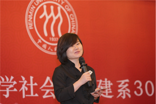 罗辑思维副总裁冯启娜作为新世纪系友代表发言。她认为,在当今极速变化的世界中,人需要有支撑的桅杆,这个桅杆一方面是在人大求学期间社会学系带给我们观照社会的价值观和知识体系,另一方面是终身学习,这也是她所从事的知识服务行业的价值。她衷心感谢人大社会学系的培养,衷心祝愿母校和母系未来的发展更美好。