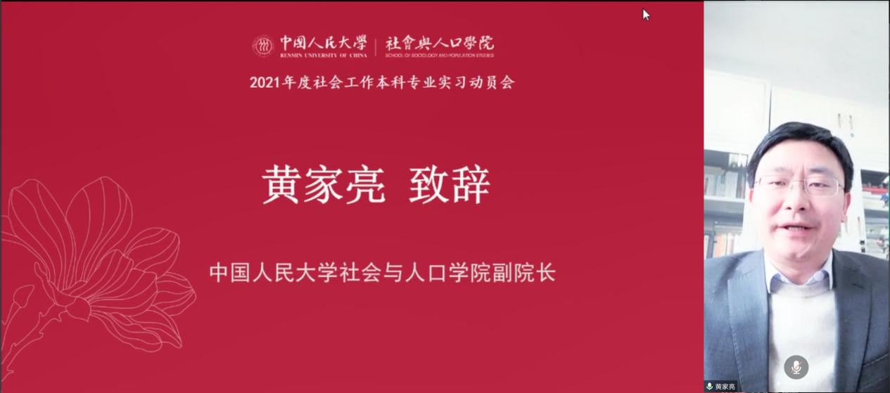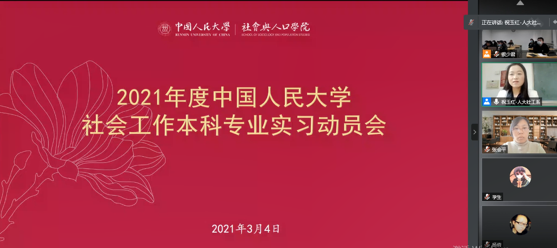 2021-03-05 文:WilliamHill中文官方网站 图:WilliamHill中文官方网站2021年3月4日下午,社会工作与社会政策系2021年度社会工作本科专业实习动员会通过线上、线下相结合的方式举办,社会与人口公司副经理黄家亮、社会工作与社会政策系系主任张会平,中国扶贫基金会、北京协和医院等10余家实习基地的部门负责人和资深社会工作者作为督导代表参会,即将开启专业实习的2018级社会工作专业全体本科生参加了动员会。本次动员会由社会工作与社会政策系副系主任祝玉红主持。